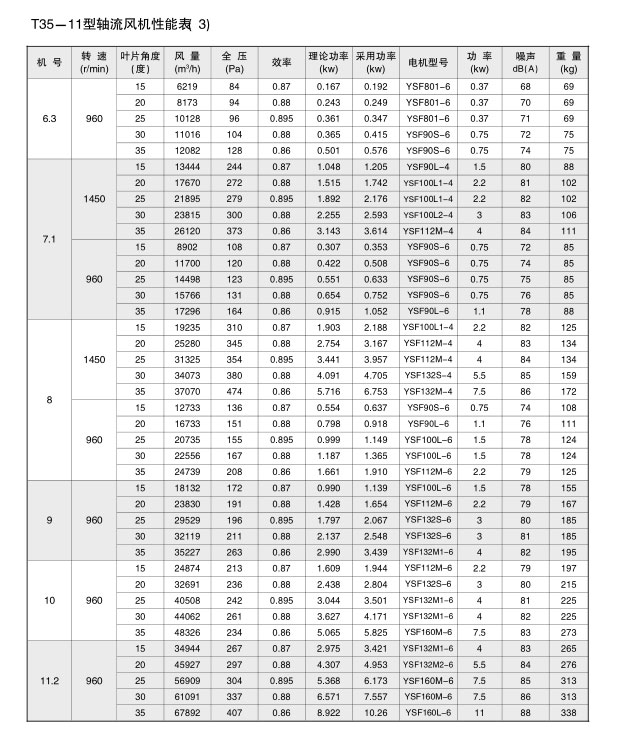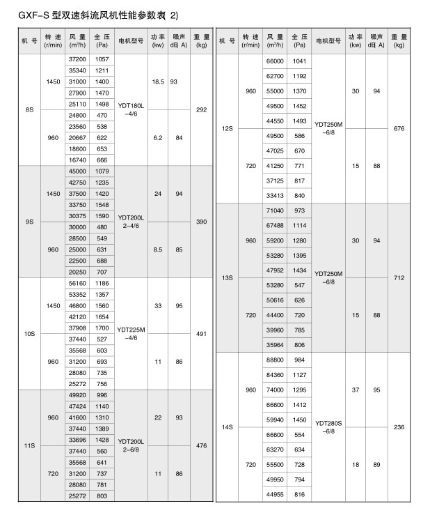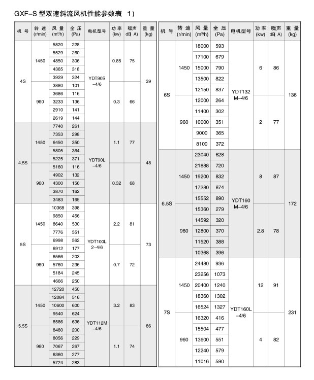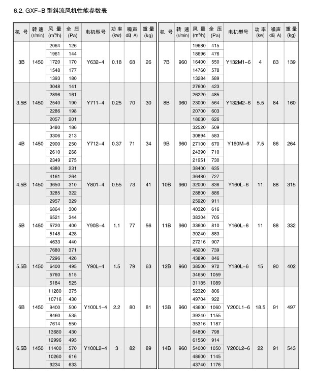 GXF系列斜流通风机按叶轮直径分为400-1400mm十四规格,按类型分为A、B、C、S四种类型,共五十八个机号。风量由3000-90000m3/h,全压由185-2500Pa;这样就给设计部门和用户单位提供了充分的选择条件,具体数据请查风机性能参数表。